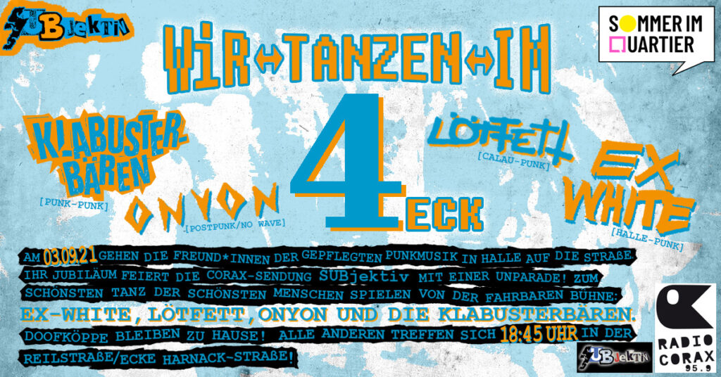 Am 3.9.2021 gehen wir mit den Freund*innen der gepflegten Punkmusik in Halle auf die Straße: Unser 21. Jubiläum feiern wir mit einer Unparade!